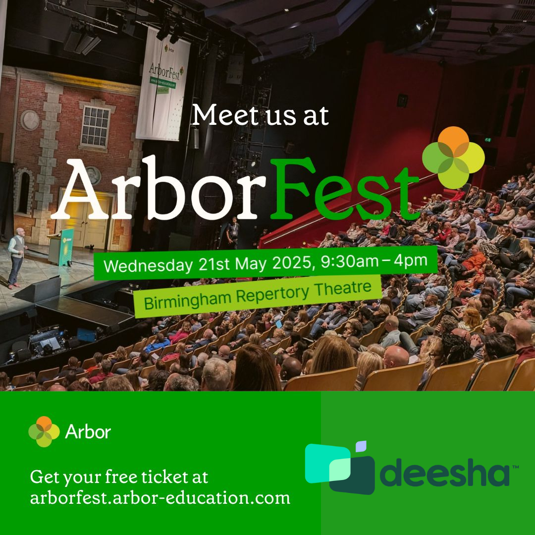 Deesha is pleased to announce that its CEO, Sarbani Bose, will be attending ArborFest 2025 tomorrow, May 21st, 2025. As Arbor Education's largest in-person customer conference, ArborFest brings together school and trust leaders from across the Arbor Community to explore "The future of work in schools" through inspiring talks and networking opportunities.